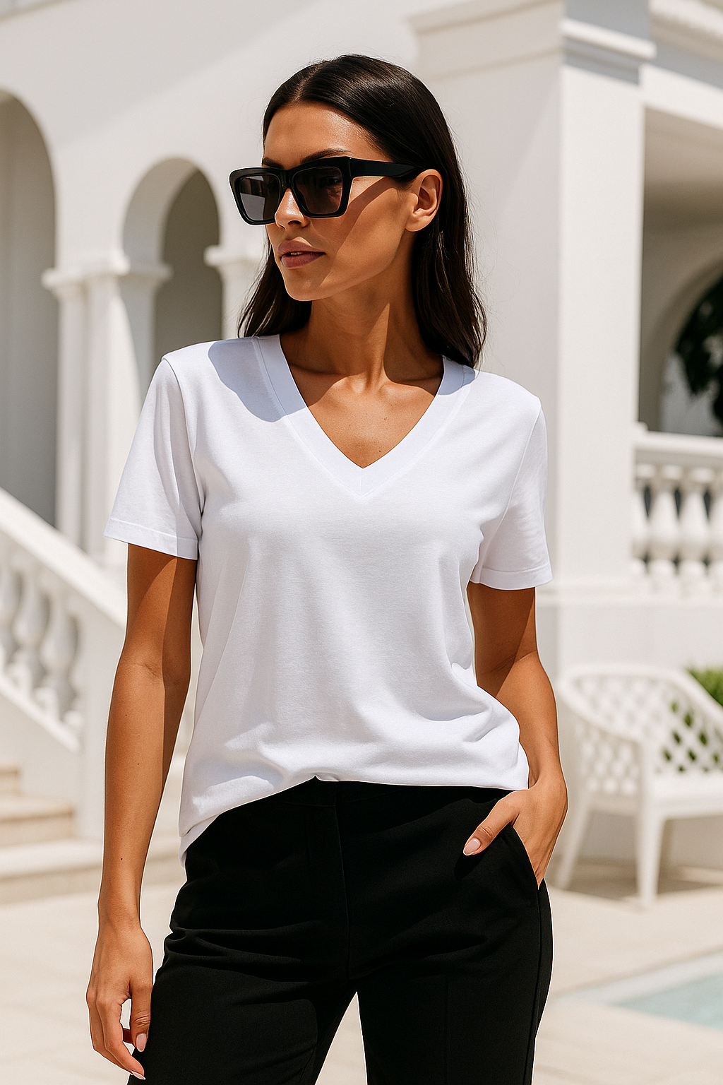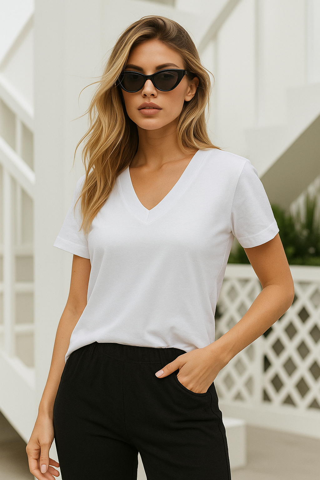 🔹 Ürün Açıklaması Kadın Beyaz Viskon V Yaka Kısa Kollu Tişört, saf ve temiz beyaz rengiyle her kombine uyum sağlar. %95 viskon ve %5 elastan karışımı sayesinde nefes alan, esnek ve dökümlü bir yapıya sahiptir. Günlük kullanımda konfor sunarken, ofis stilinde veya özel kombinlerde de şık bir tercih oluşturur. Zarif V yaka detayı feminen ve modern bir görünüm kazandırır.