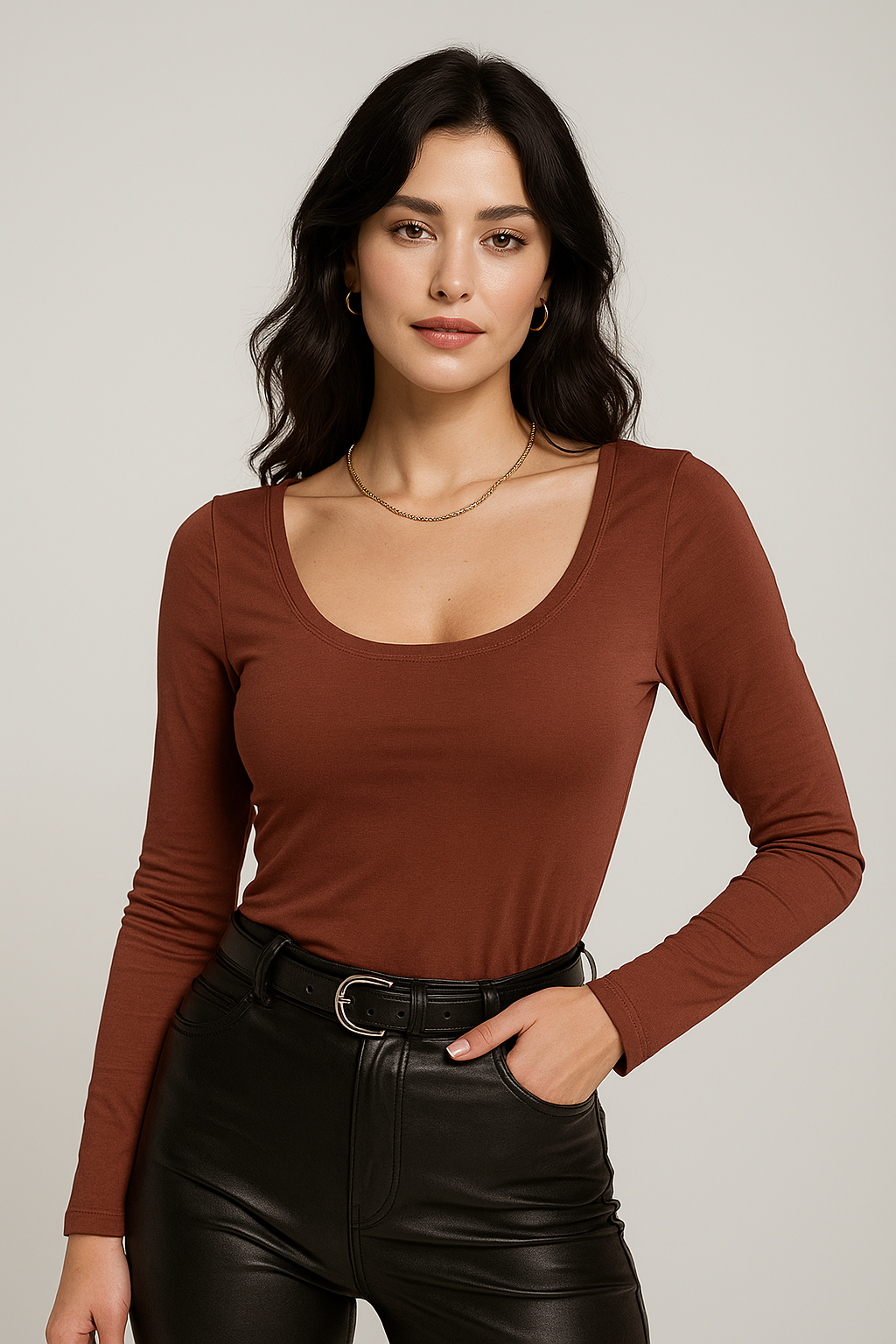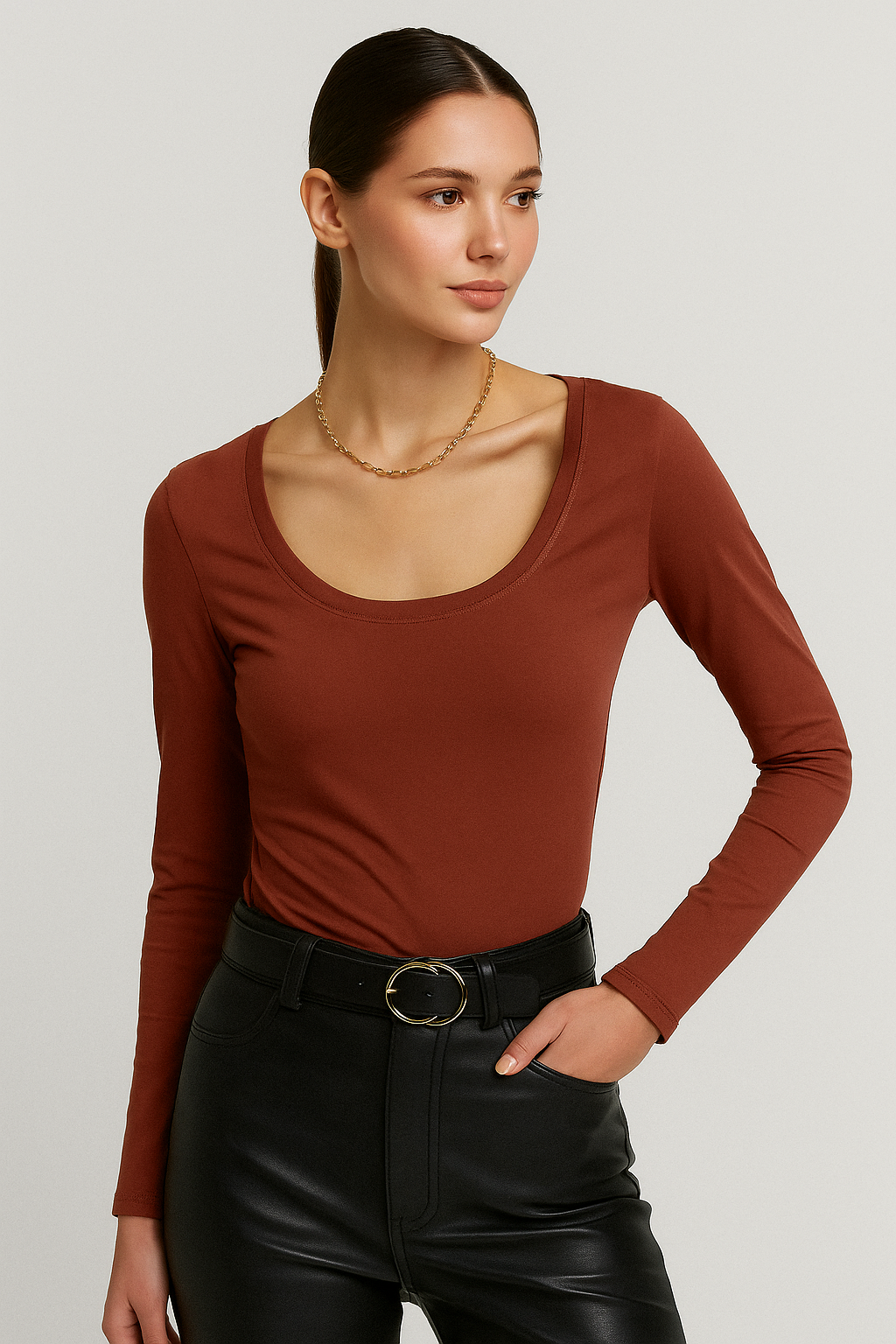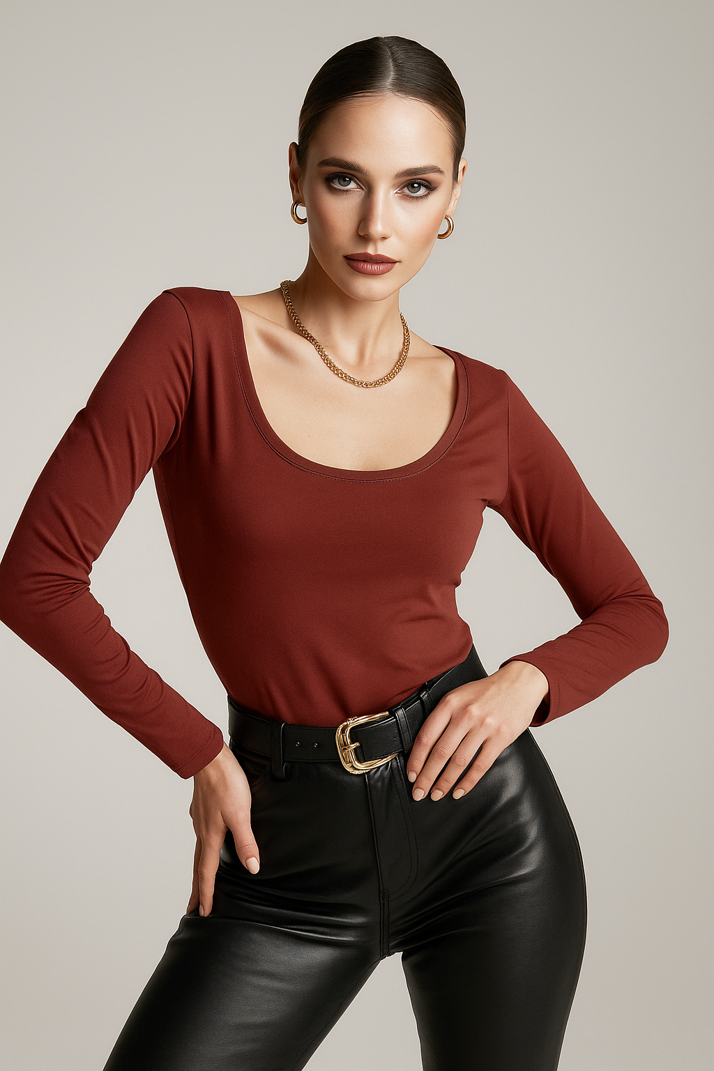 Kadın Bordo U Yaka Uzun Kollu Bluz, zarif tasarımı ve esnek yapısıyla günlük stilinize modern bir dokunuş katar. Vücudu saran fit kesimi sayesinde hem şık hem de rahat bir görünüm sunar. Bordo rengiyle zamansız bir şıklık sağlayarak iş hayatında, günlük kombinlerde ya da özel davetlerde kolayca tercih edilebilir.
