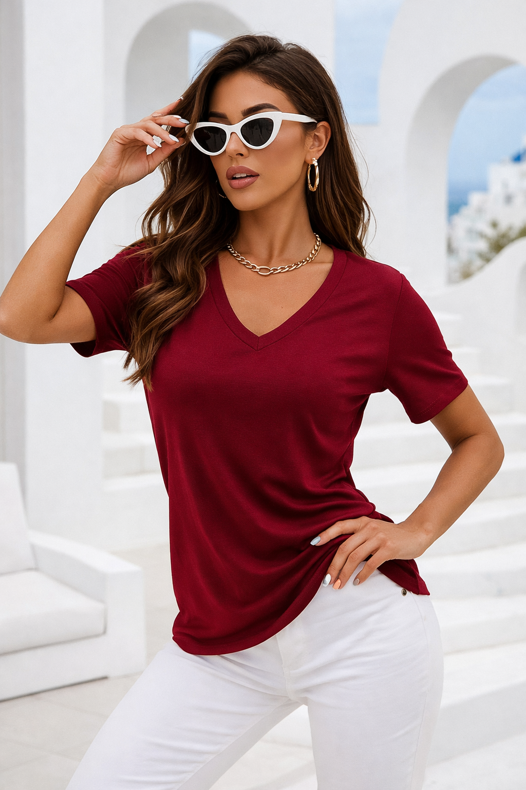 🔹 Teknik Detaylar Ürün Adı: Kadın Bordo Viskon V Yaka Kısa Kollu Tişört Materyal: %95 Viskon, %5 Elastan Kumaş Özelliği: Yumuşak, dökümlü, esnek, nefes alan Kalıp: Rahat kalıp – konforlu kullanım Kol Tipi: Kısa kollu Yaka Tipi: V yaka Renk: Bordo Kullanım Alanı: Günlük kombinler, ofis stili, şehir hayatı, hafta sonu görünümleri