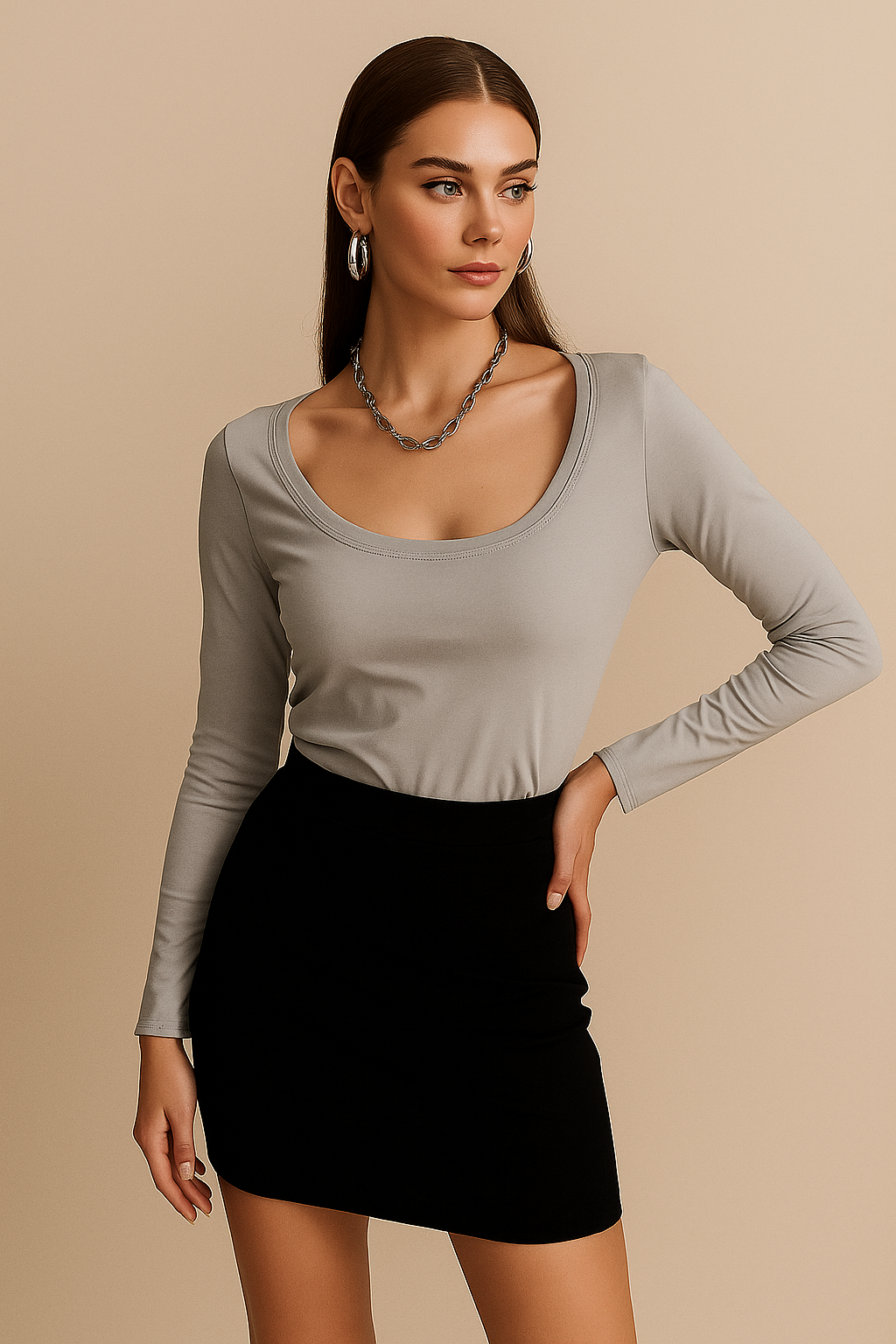 Kadın Gri U Yaka Uzun Kollu Bluz, zarif tasarımı ve esnek yapısıyla günlük stilinize modern bir dokunuş katar. Vücudu saran fit kesimi sayesinde hem şık hem de rahat bir görünüm sunar. Gri rengiyle modern ve sade bir şıklık sunarak iş hayatında, günlük kombinlerde ve özel davetlerde kolayca tercih edilebilir.