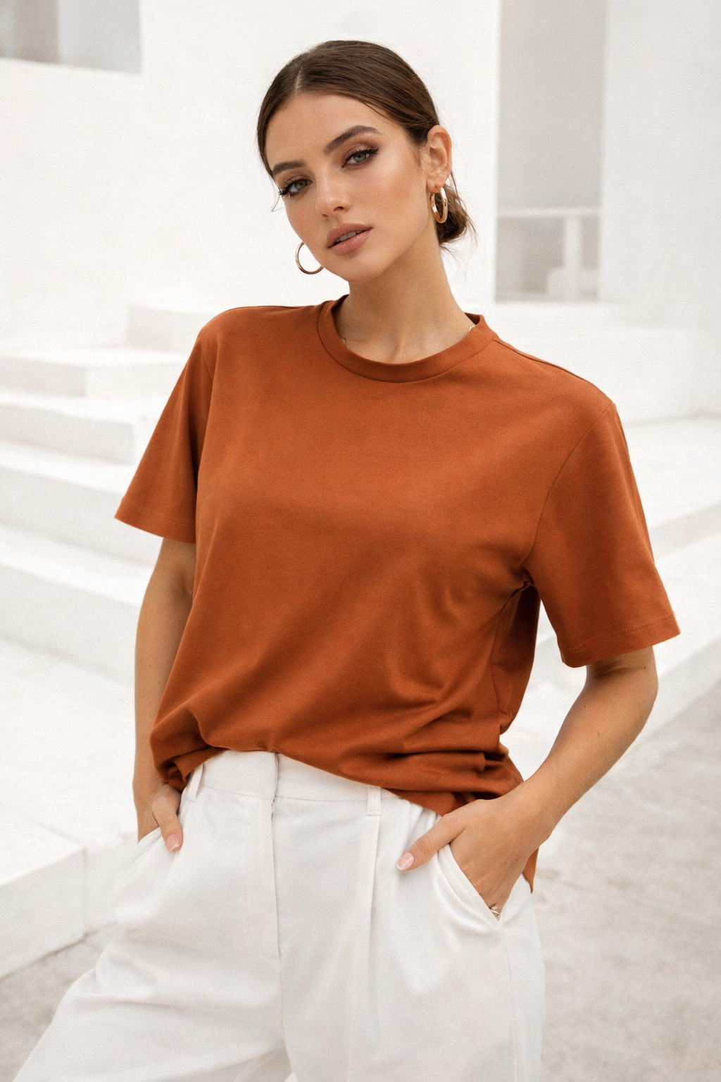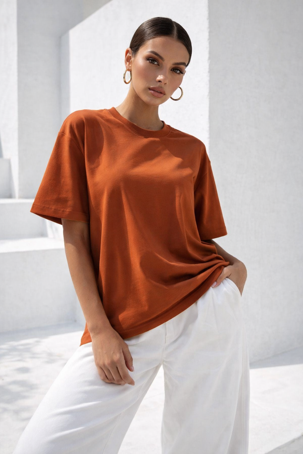 Kadın Kiremit Premium Modal Kumaş Oversize T-Shirt, yumuşak ve akışkan dokusuyla gün boyu üstün konfor sunar. Premium modal kumaşı sayesinde hafif, nefes alabilir ve cilde ipeksi bir temas sağlar.