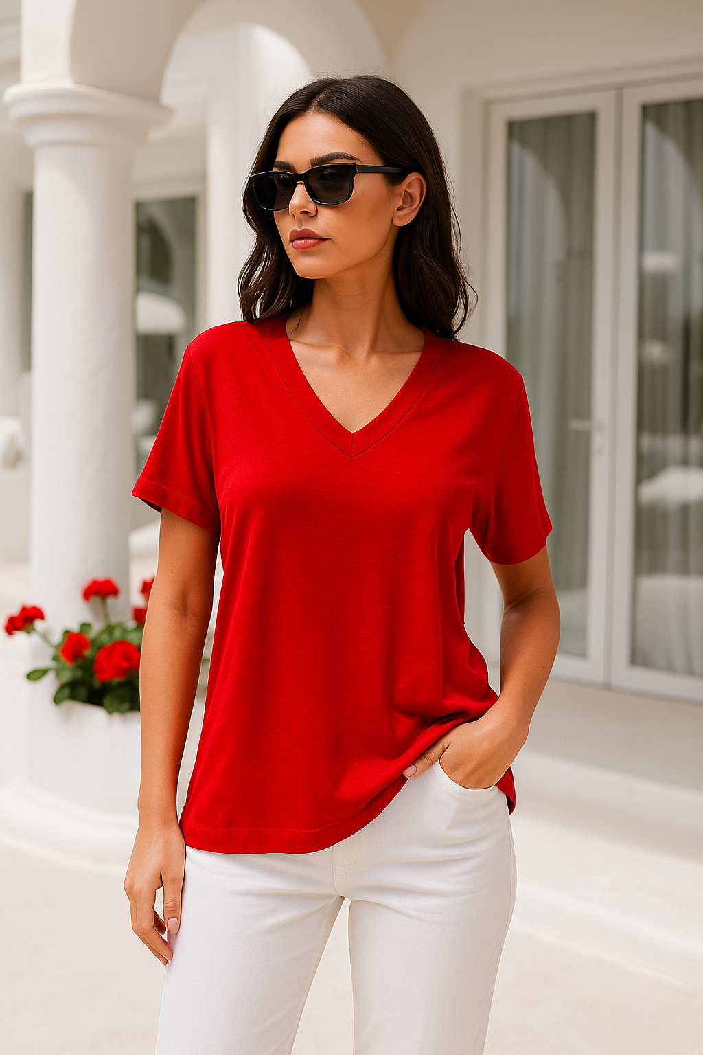 🔹 Ürün Açıklaması Kadın Kırmızı Viskon V Yaka Kısa Kollu Tişört, canlı kırmızı rengiyle dikkat çeken ve kombinlerinize enerji katan bir parçadır. %95 viskon ve %5 elastan karışımıyla nefes alan, esnek ve dökümlü bir yapıya sahiptir. Günlük kullanımda rahatlık sağlarken, özel günlerde veya ofis stilinde de şık bir tercih oluşturur. Zarif V yaka detayı feminen bir dokunuş katar.