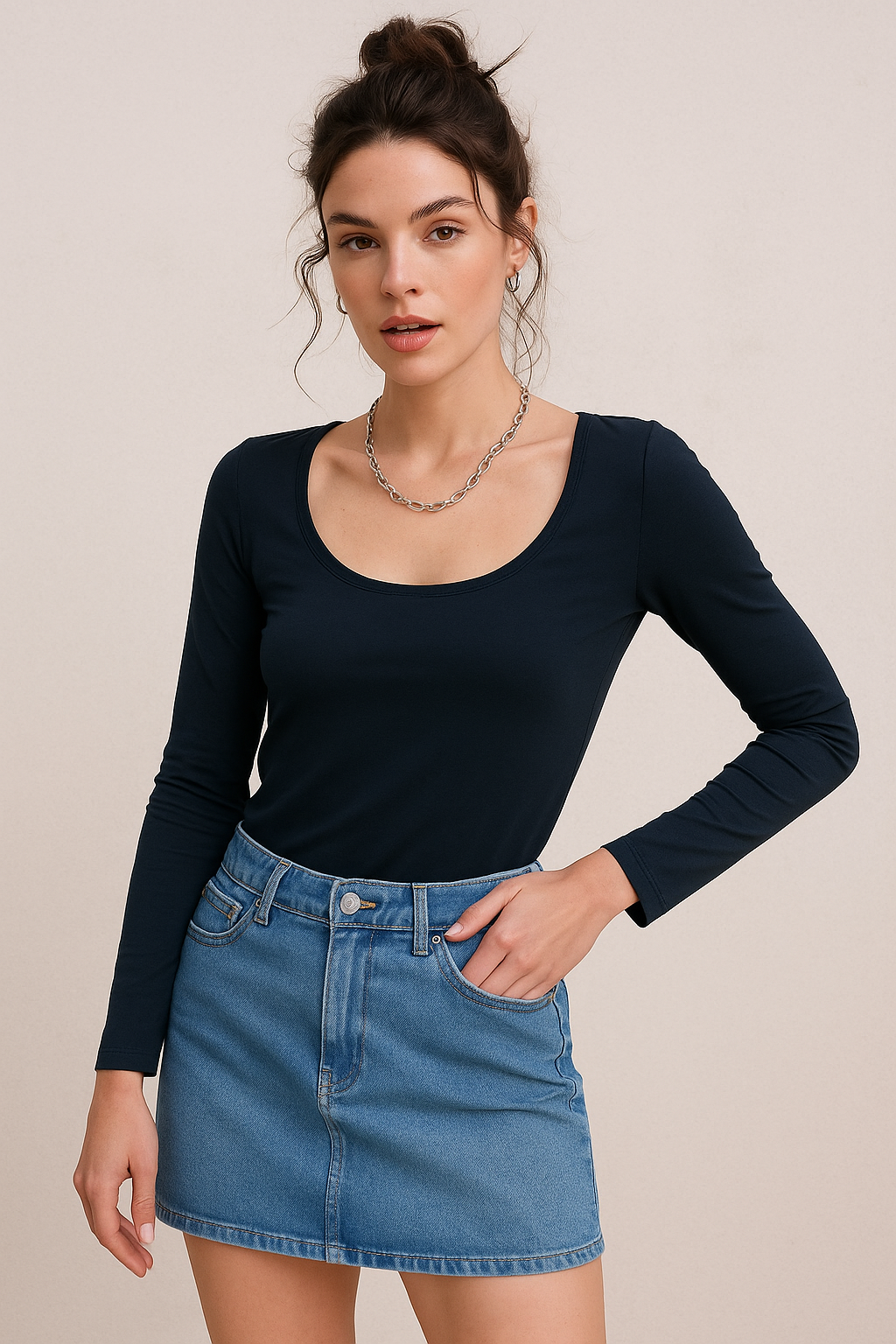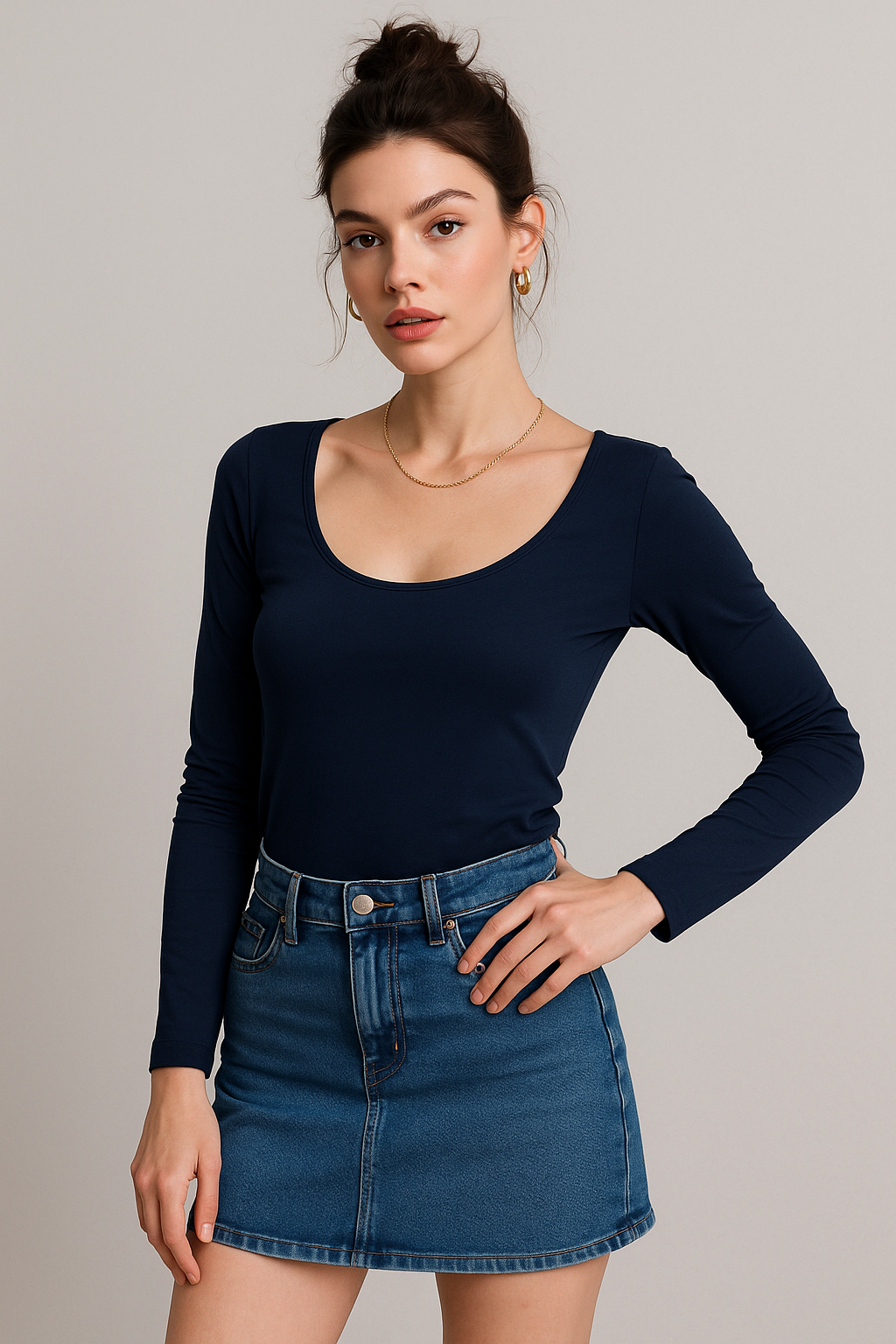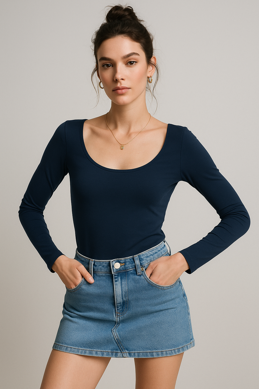 Kadın Lacivert U Yaka Uzun Kollu Bluz, zarif tasarımı ve esnek yapısıyla günlük stilinize modern bir dokunuş katar. Vücudu saran fit kesimi sayesinde hem şık hem de rahat bir görünüm sunar. Lacivert rengiyle sofistike bir şıklık sunarak iş hayatında, günlük kombinlerde ve özel davetlerde kolayca tercih edilebilir.