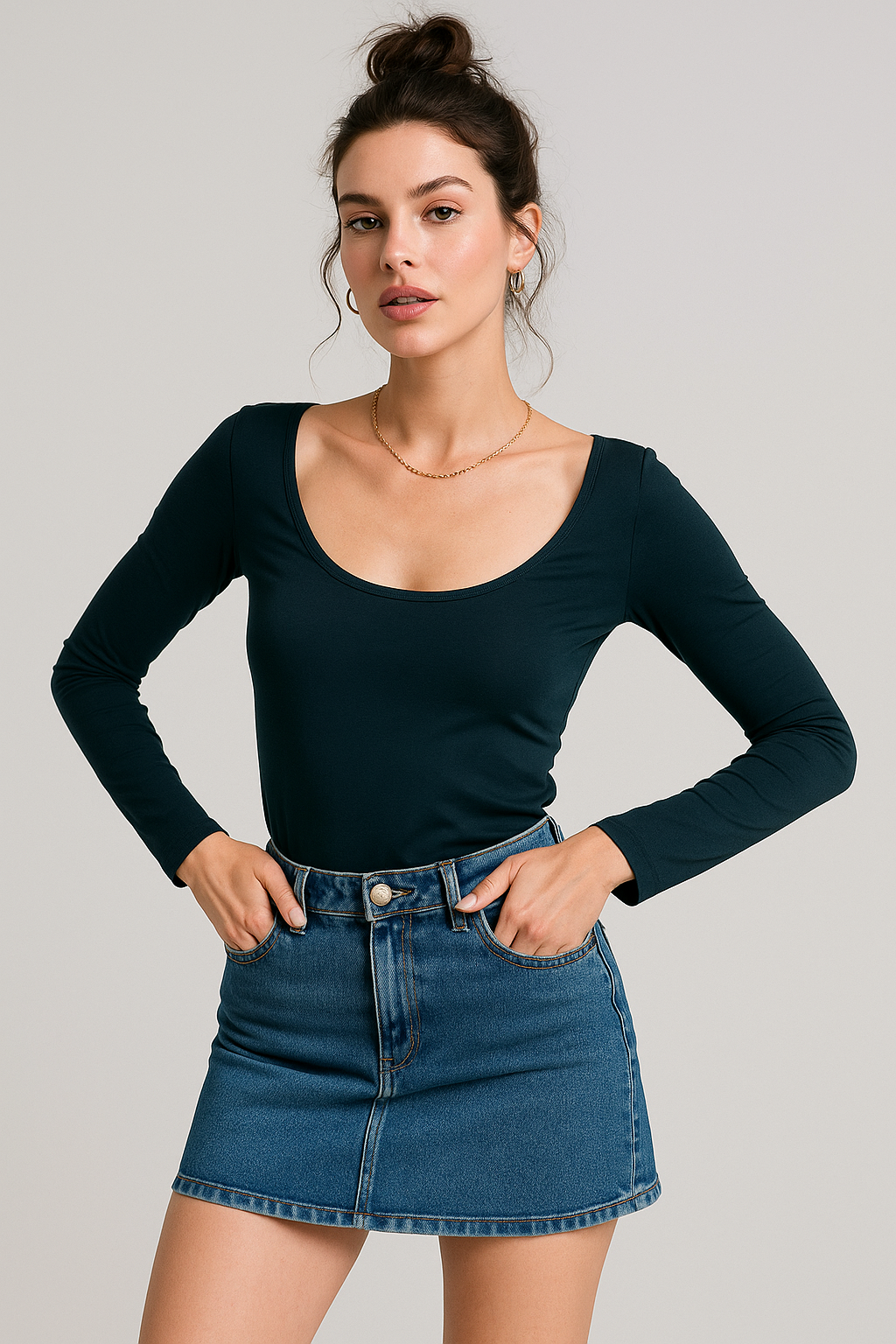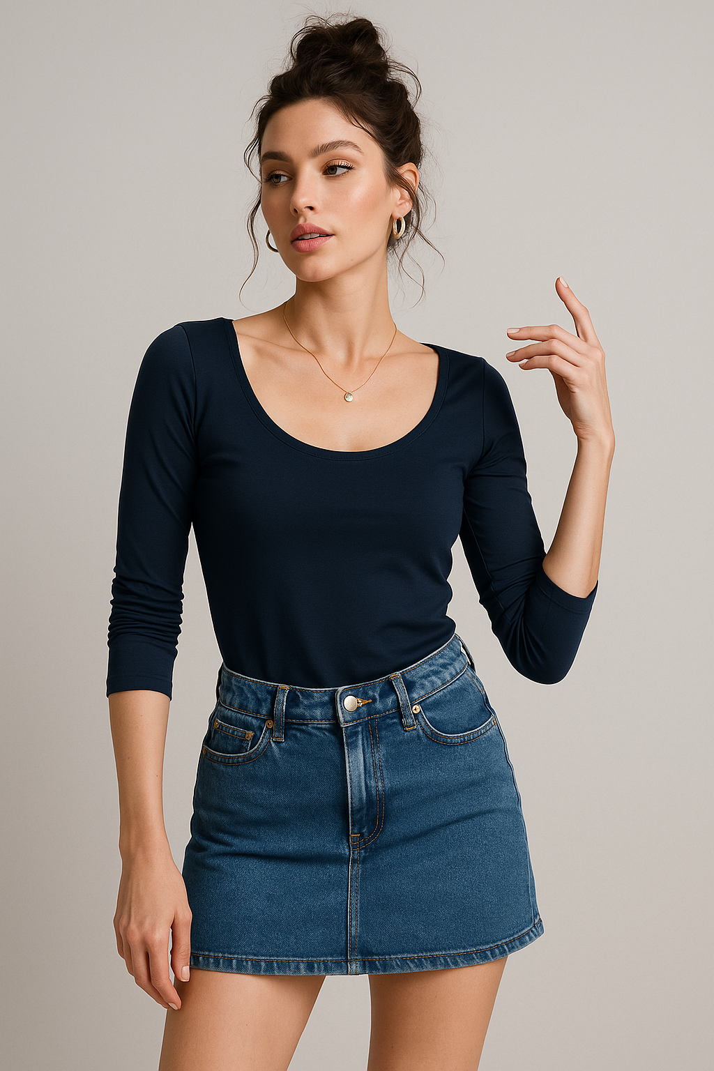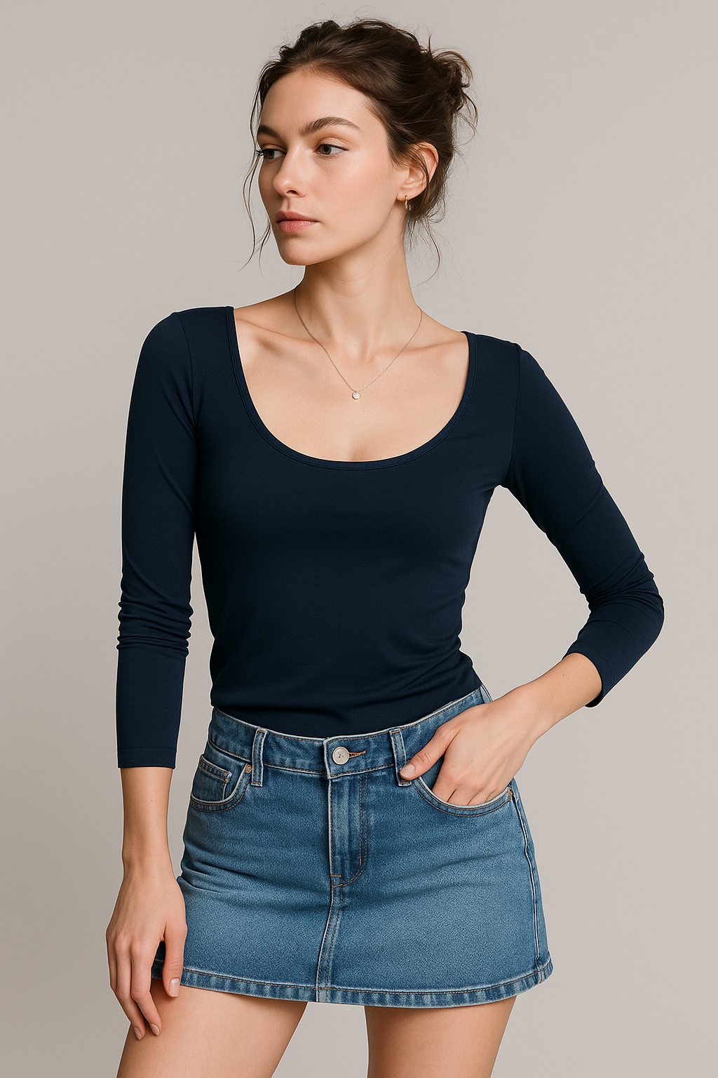 Kadın Lacivert U Yaka Uzun Kollu Bluz, zarif tasarımı ve esnek yapısıyla günlük stilinize modern bir dokunuş katar. Vücudu saran fit kesimi sayesinde hem şık hem de rahat bir görünüm sunar. Lacivert rengiyle sofistike bir şıklık sunarak iş hayatında, günlük kombinlerde ve özel davetlerde kolayca tercih edilebilir.