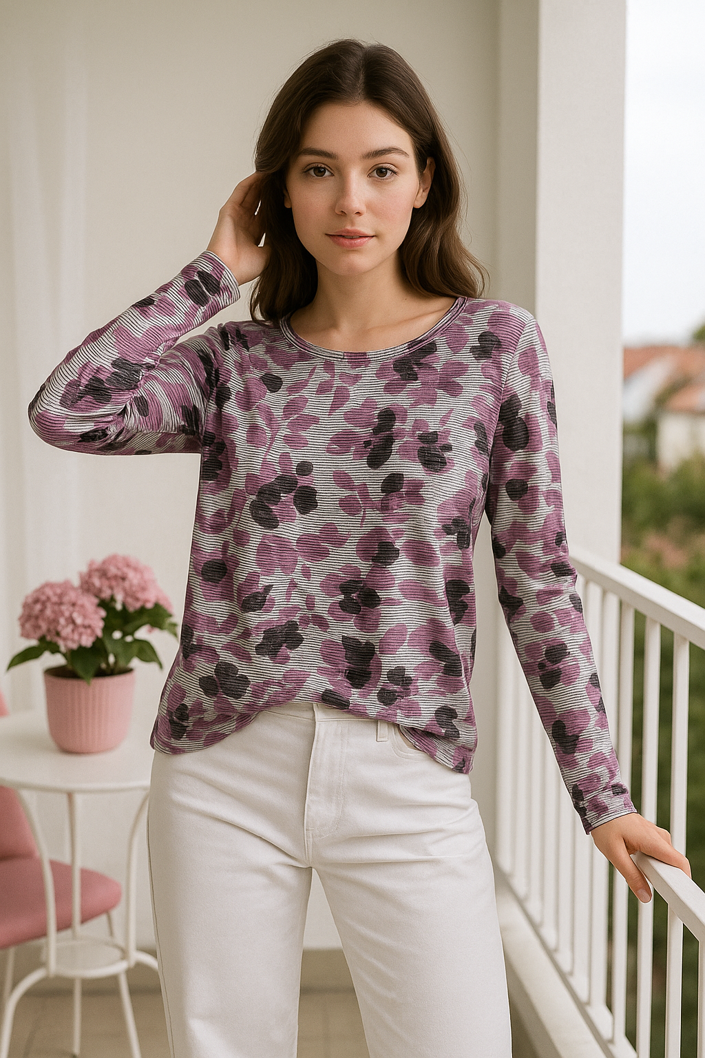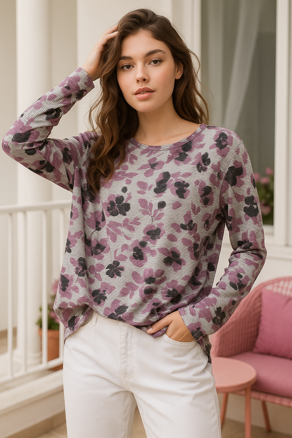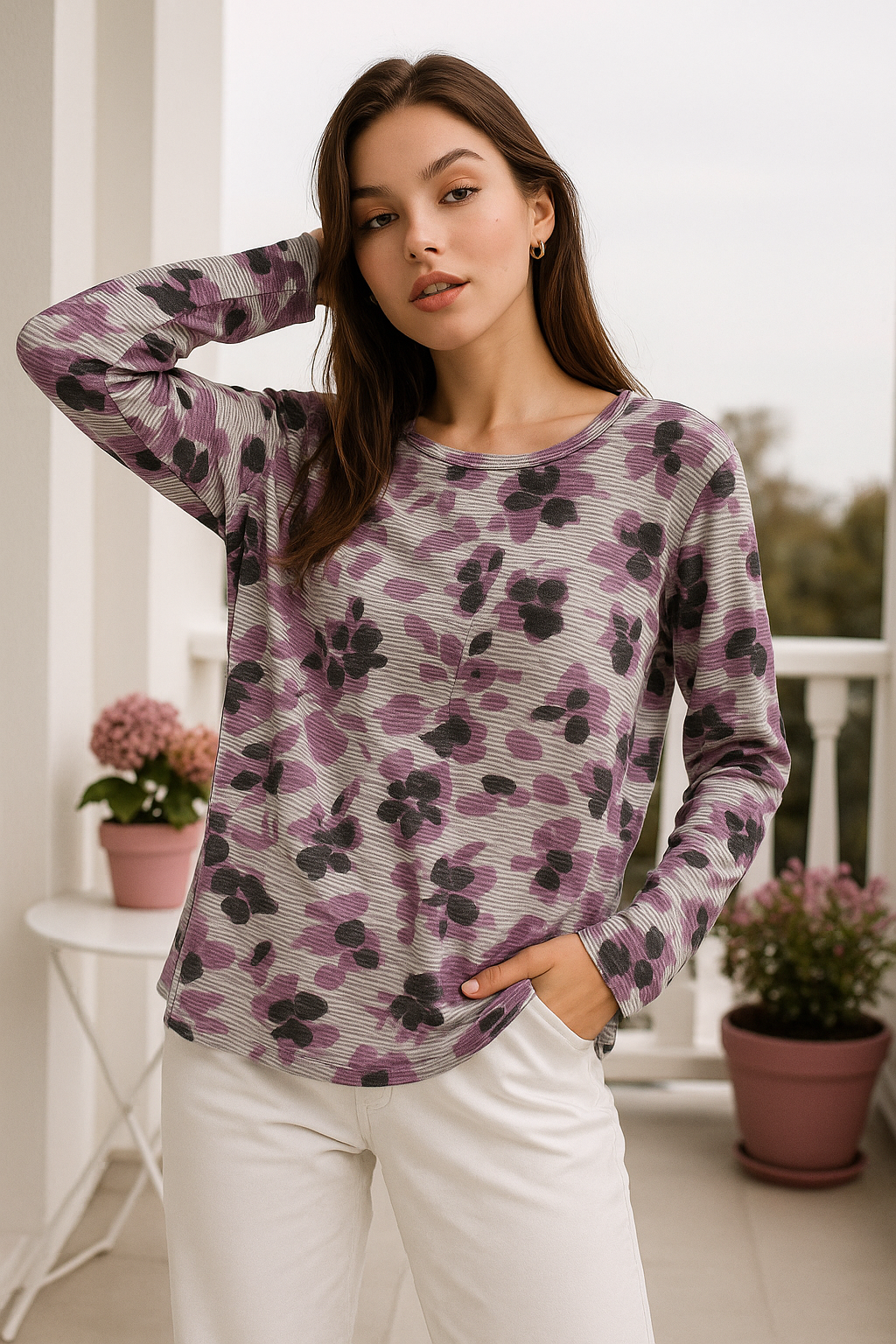 🔹 Ürün Açıklaması Kadın Mor Desenli Bisiklet Yaka Uzun Kollu Bluz, modern desenleri ve konforlu kumaşıyla stilinize zarif bir hava katar. Rahat kalıbı sayesinde günlük hayatta şıklığınızı tamamlarken, iş kombinleriniz ve özel davetlerinizde de kolayca tercih edebileceğiniz çok yönlü bir parçadır.