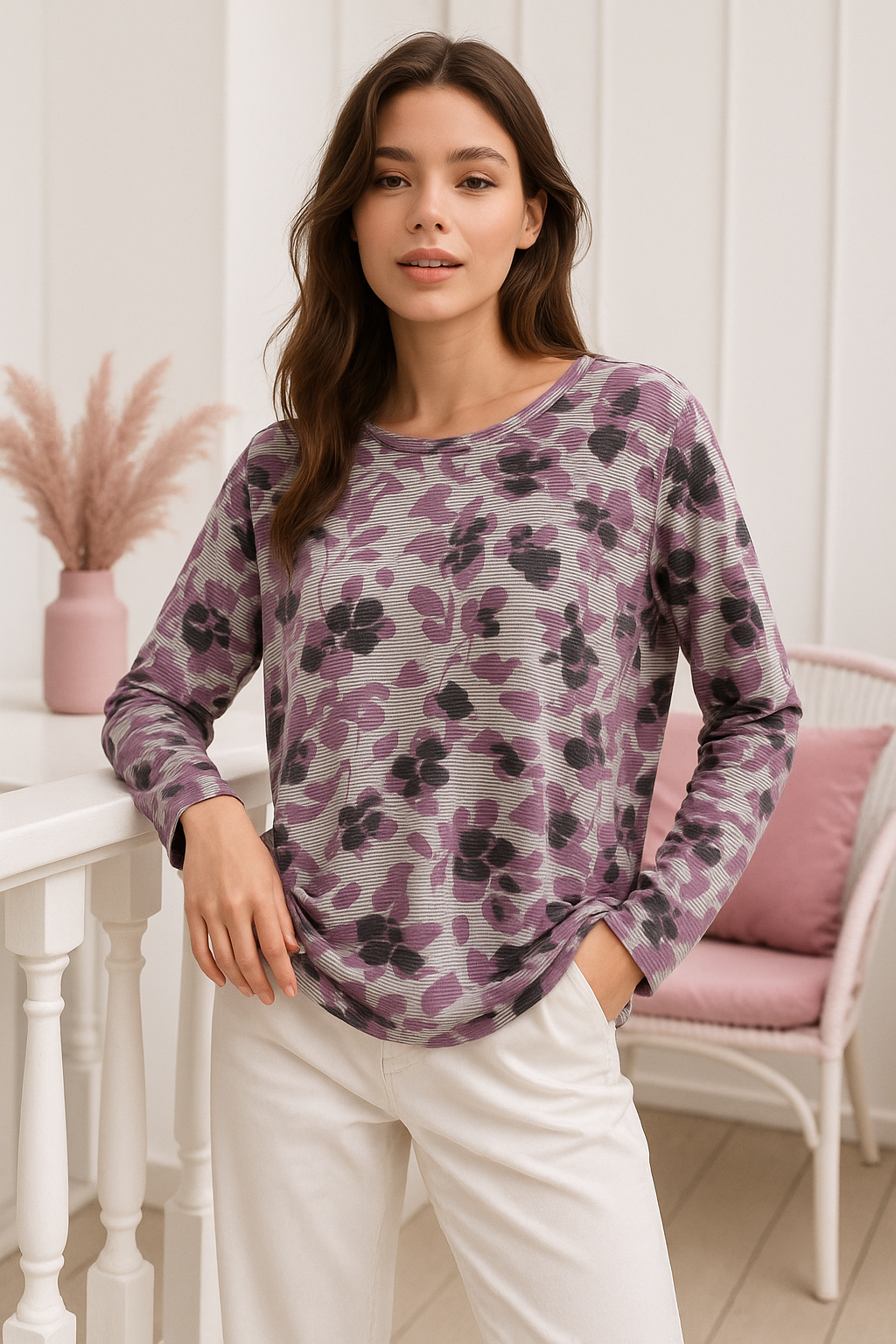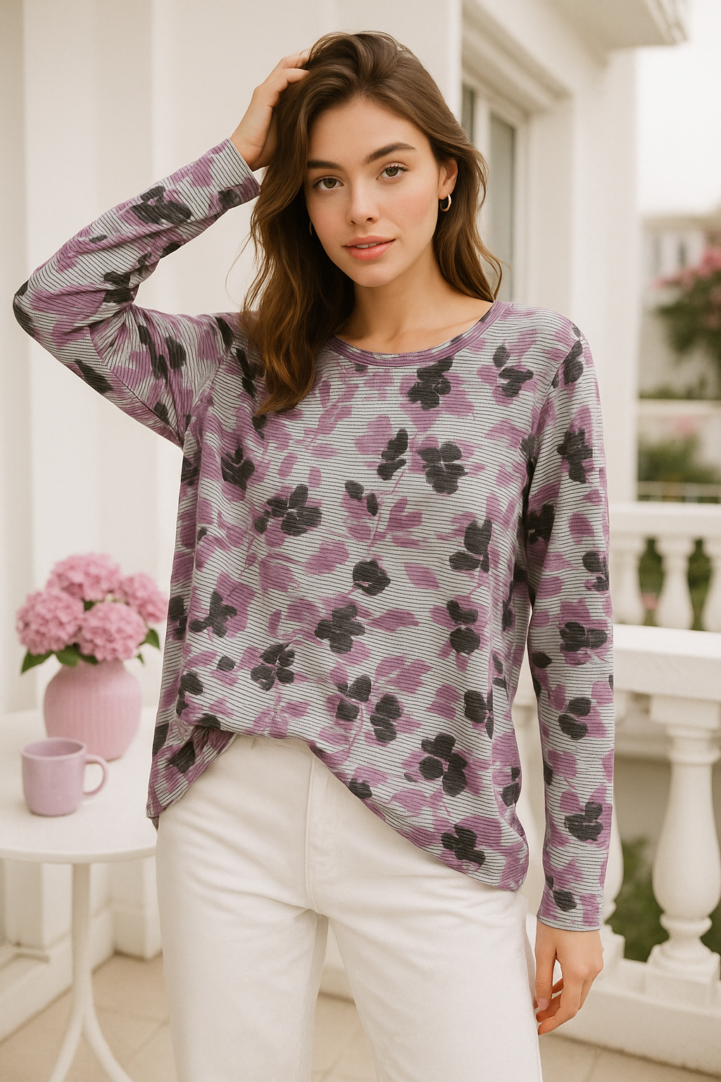 Ürün Adı: Kadın Mor Desenli Bisiklet Yaka Uzun Kollu Bluz