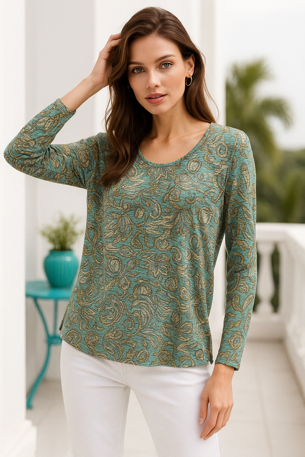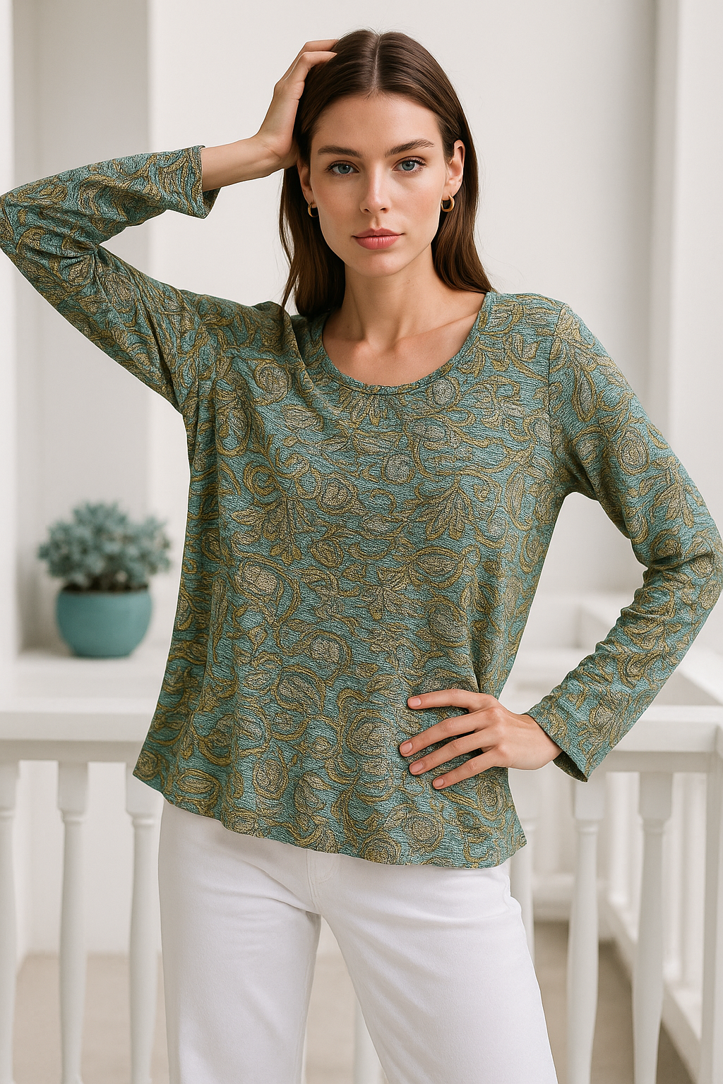 🔹 Ürün Açıklaması Kadın Turkuaz Desenli Bisiklet Yaka Uzun Kollu Bluz, modern desenleri ve konforlu kumaşıyla stilinize zarif bir hava katar. Rahat kalıbı sayesinde günlük hayatta şıklığınızı tamamlarken, iş kombinleriniz ve özel davetlerinizde de kolayca tercih edebileceğiniz çok yönlü bir parçadır.