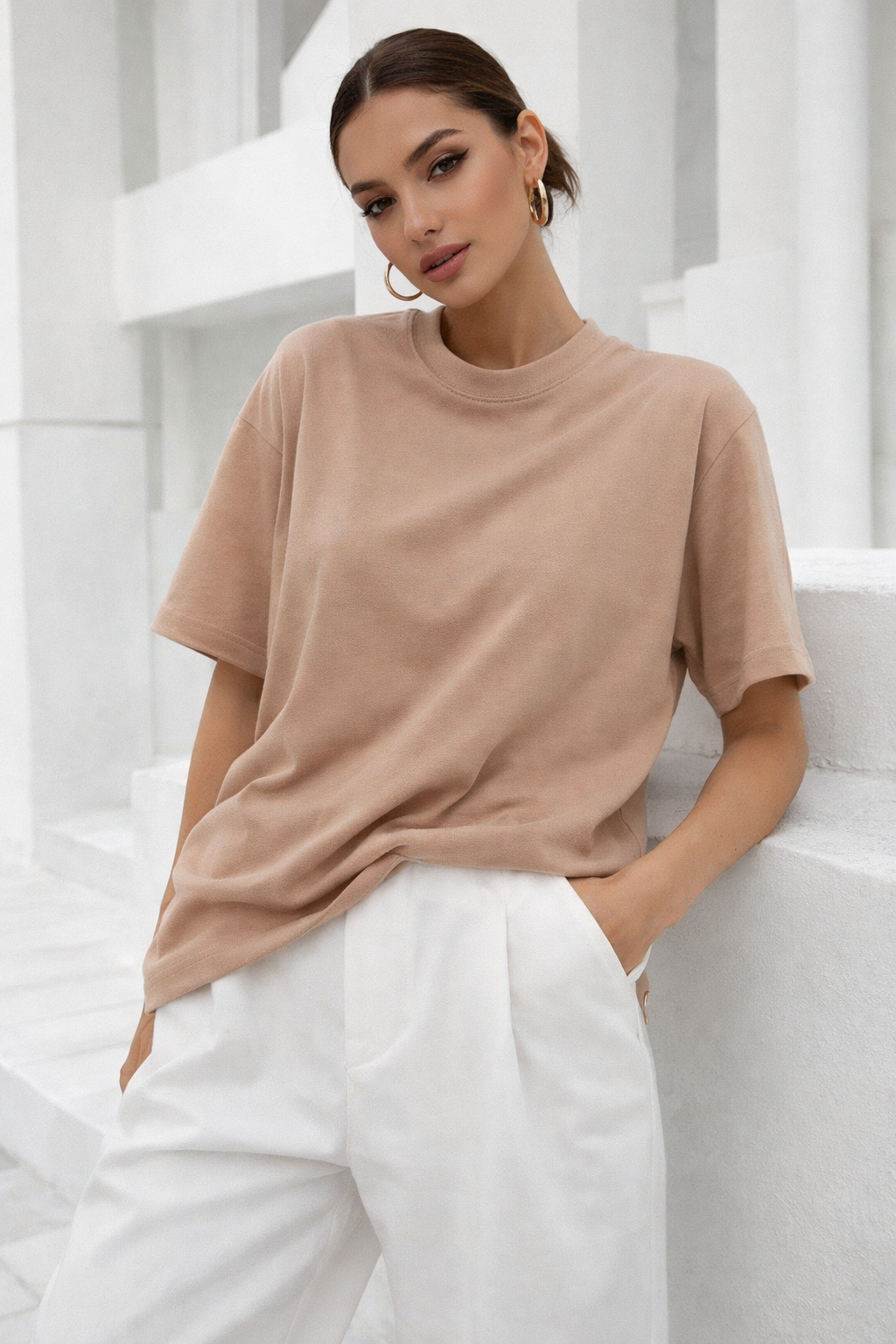 Kadın Vizon Premium Modal Kumaş Oversize T-Shirt, yumuşak ve akışkan dokusuyla gün boyu üstün konfor sunar. Premium modal kumaşı sayesinde hafif, nefes alabilir ve cilde ipeksi bir temas sağlar.