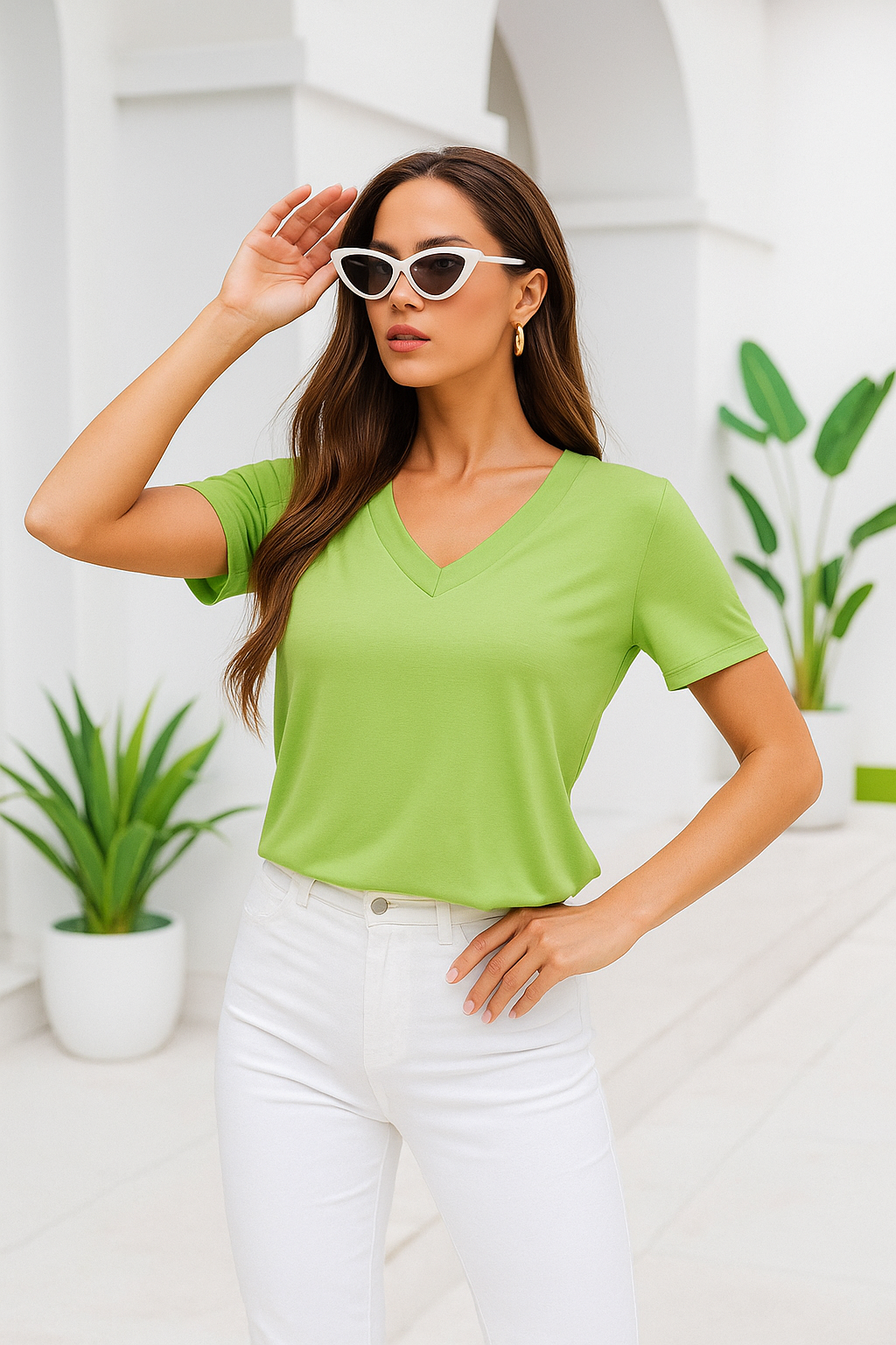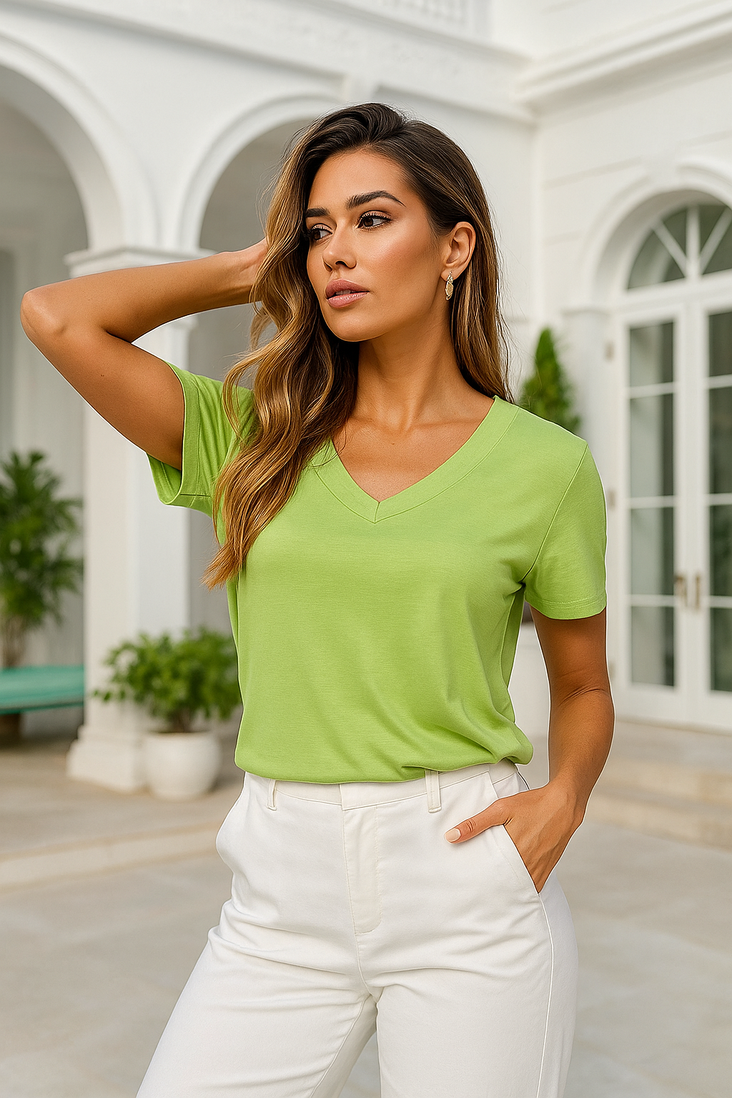 🔹 Ürün Açıklaması Kadın Yeşil Viskon V Yaka Kısa Kollu Tişört, canlı ve doğal yeşil rengiyle kombinlerinize taze ve şık bir dokunuş katar. %95 viskon ve %5 elastan karışımı sayesinde nefes alan, esnek ve dökümlü bir yapıya sahiptir. Günlük kullanımda rahatlık sunarken, ofis stilinde veya özel kombinlerde de modern bir tercih oluşturur. Zarif V yaka detayı feminen ve şık bir görünüm sağlar.